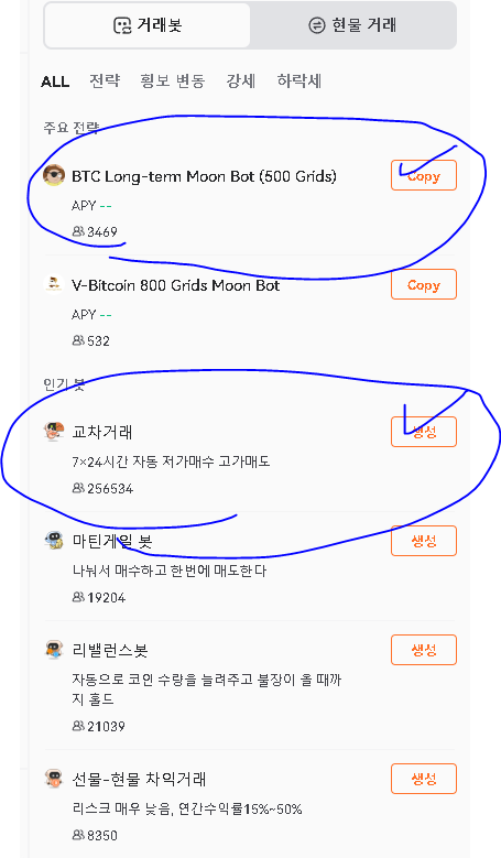 아까 보셧던 이미지와 마찬가지로 현물거래 탭으로 들어가주세요 봇을 클릭해줍니다.